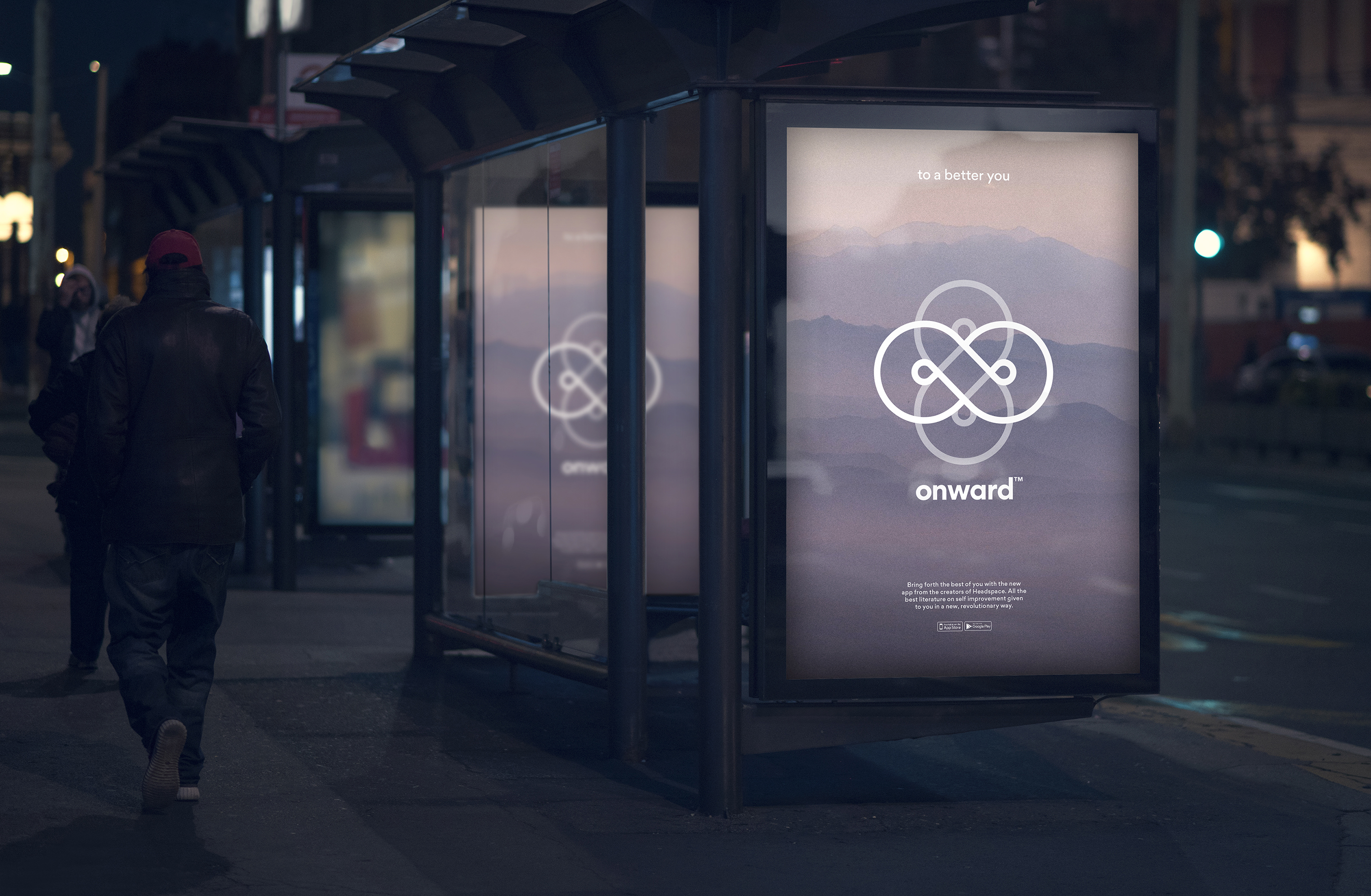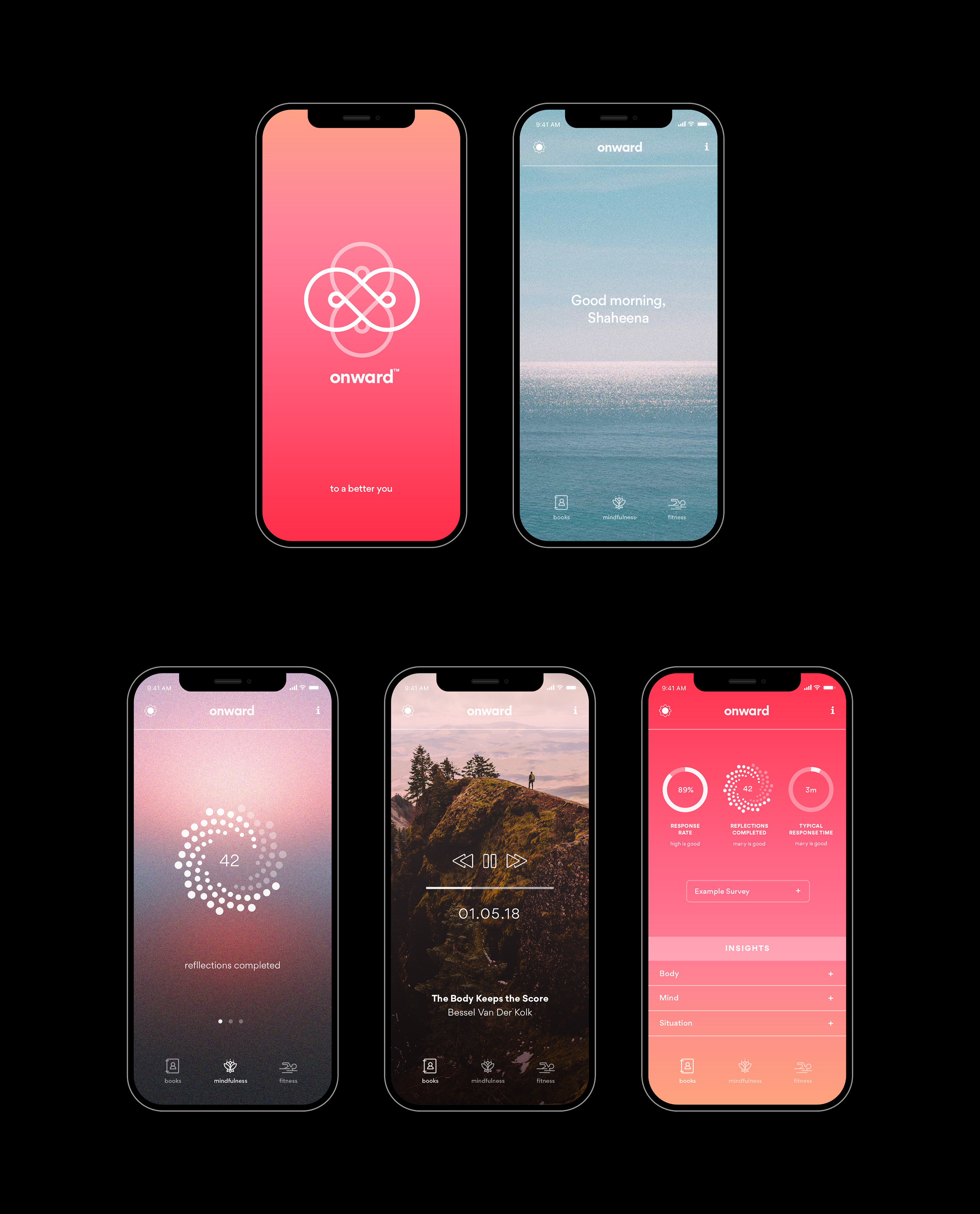 Identity and app design for a Onward, a new app featuring wellness audio books, as well as mindfulness, meditation and relaxation exercises.